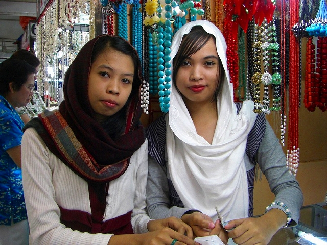 パサイ・シティのバクラランと云えば、庶民の買い物どころで有名だ。また、オルティガスの先にあるグリーンヒルも穴場中の穴場としていつも人でごった返している。その両方が姿を消してしまったのだ。 バクラランはバクララン教会の脇の通りからLRTのバクララン駅まで道路いっぱいに衣類や靴・鞄を売る屋台が軒を連ねており、信じられない値段で売っていた。コピーブランド商品もごちゃ混ぜになっていた。 それが最近、訪問してみたら、きれいさっぱりなくなっていた。この道路がこんなに広かったんだとあらためて認識したくらいだ。それでも生活の糧を奪われた人たちが屋台の代わりに商品を担いで、いつでも逃げられるようにしている。警察が来るとあわてて路地に逃げ込んでいた。庶民のしたたかさを感じるが、哀れにもなる。何も彼らは警察に追われるような悪いことをしているわけでもなく、ただ必死に生きようとしているだけなのだ。 LRTの高架下の屋台も固定の屋根や屋台は撤去され、車輪のついた移動式の屋台が出ている。これもいつでも移動して逃げられるようにしているのだろう。バクラランはこれら屋台だけではなくて、道の両側のビルの中には一坪程度の店が数千軒がひしめく問屋街だ。だから街の機能は変わりなく、平日でも多くの人が買い物をしている。しかし、何かバクラランらしさをなくしてしまって、面白みが無い。 一方、グリーンヒルは元々ビルの中に一坪ショップがひしめいて、バッグ、衣類、時計、携帯などのコピーブランドや装飾品・民芸品・パソコンなどを売っていたのだが、本物(装飾品、民芸品、パソコンなど)を売る店を除いてすべて一掃されてしまったのだ。 こちらは徹底していて、バクラランのようにこそこそと商品を担いで売っている人もいない。なんともはや寂しい限りだ。ここでの商売を糧として生きていた人はどうしているのだろう。あの山のような商品はどこへ行ってしまったのだろう。 ここでコピー商品を買い求める人々が、それがなくなったからといって、本物のルイビトンやシャネルのバッグを買うはずも無い。アキノ新政権は一体庶民の味方なのだろうか。大手ブランドの利益にも寄与するはずもないコピーブランドの一掃を行い、多くの庶民の生活の糧を奪い、さらに庶民の買い物の楽しみを奪うという、なんとも意味のないパーフォーマンスだ。 私の相棒のジェーンは、「すぐに元に戻るわよ」と気楽なことを云ってたが、私としても「ショッピングの穴場」として、ご家族を案内したのに、面目が丸つぶれだった。 唯一もとのグリーンヒルらしさを保っていたのが、装飾品売り場だ。数百軒もあろうかというショップは格安の真珠を中心とする装飾品を売っている。モスリム (回教徒)が多いが、このモスリム姉妹の写真を撮るために、1000ペソの大枚をはたいてネックレスを買うはめになってしまった。同行した8歳のお嬢さんにお母さんがことのいきさつを説明していたが、理解できなかったらしい。男心を知るにはもうちょっと時間がかかりそうだ。